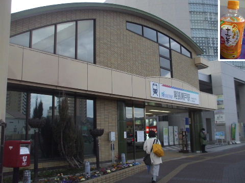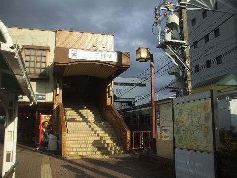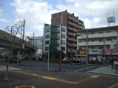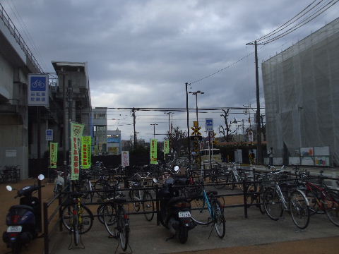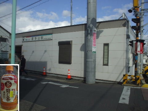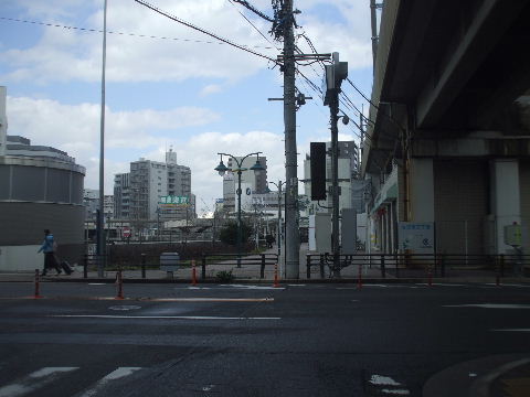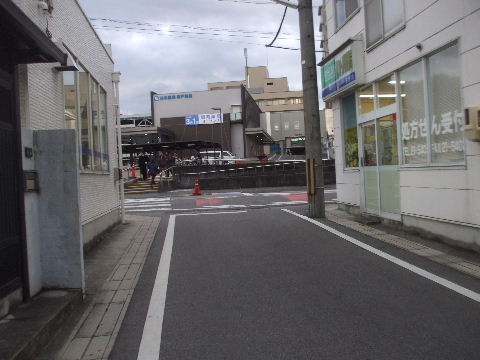 13:59喜多山駅に突き当たり左折。今は高架工事中で駅舎は仮の もの。駅前のコンビニで水分調達。 |