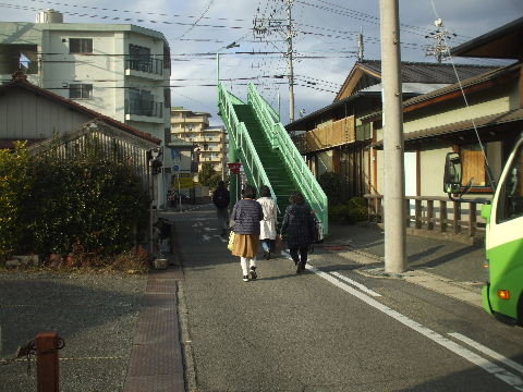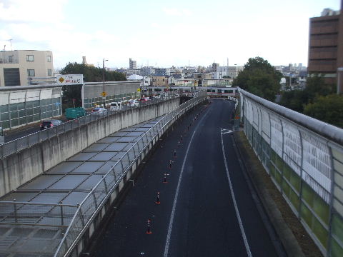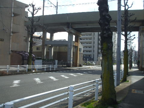 14:10踏切少し北にある歩道橋で国道を横断。国道中央の蓋をされ ているようなところの下を高速道路が通っていてこれはすでに瀬戸 線と立体交差している。瀬戸線が高架化されれば一般道の踏切も なくなる。 |