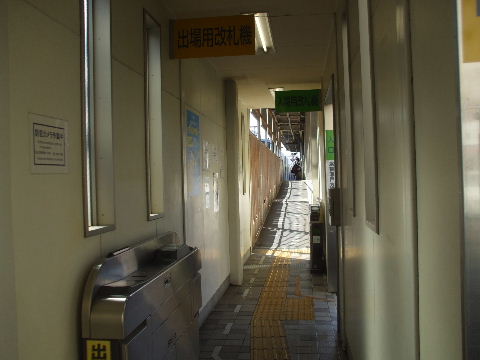 13:30瓢箪山駅横を通過。元々改札口のなかった尾張瀬戸方面に 後から設置した改札口。狭いので出る入るが別々の改札機で縦に 並んでいる。 |