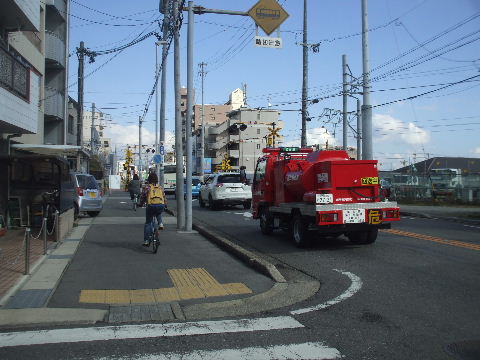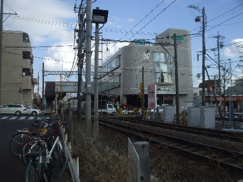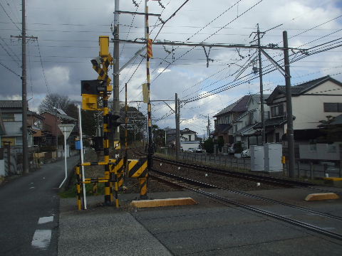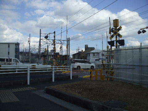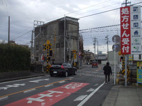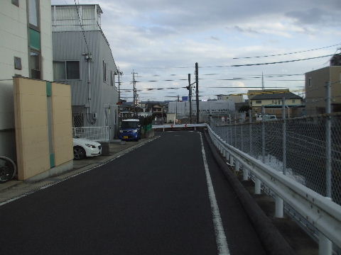 | 16:26愛環の高架橋をくぐったら左折、踏切を渡る。 |