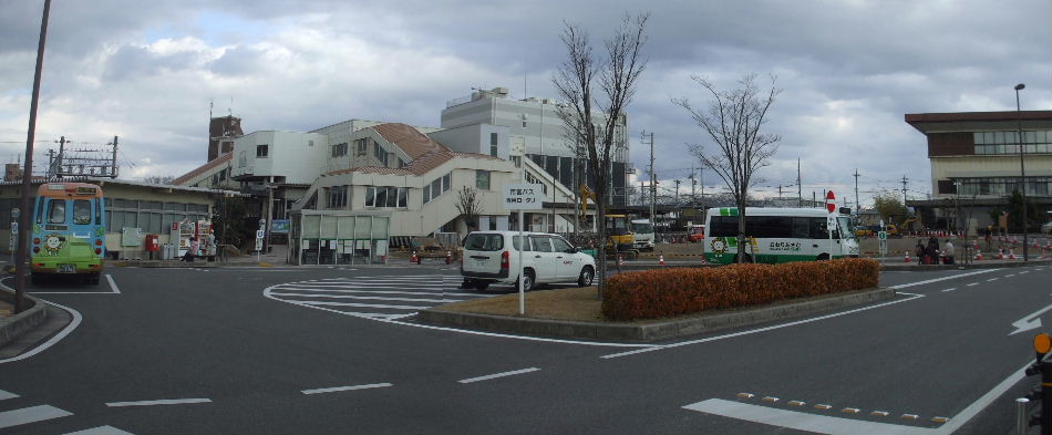 13:45小幡駅横を通過。橋上駅舎で線路左(北)側には市バス・タク シー乗り場がある。 |