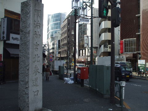 9:12代々木駅前交差点角に「明治神宮北参道口」の石碑。さらに 南へ。 |