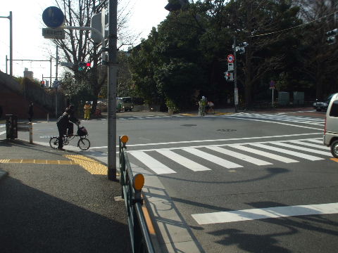14:51牛込消防署前の交差点。東西線は直進の細い道の下を進む が大江戸線は左斜めに折れて進む。 |