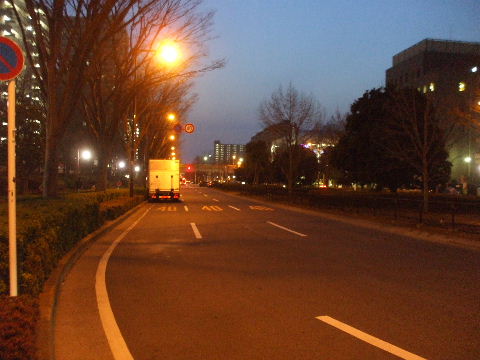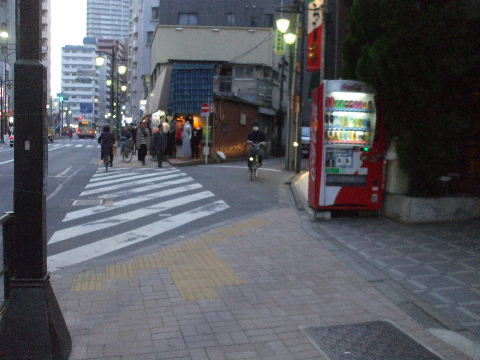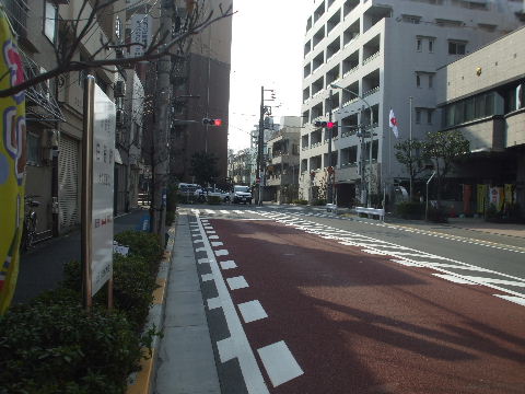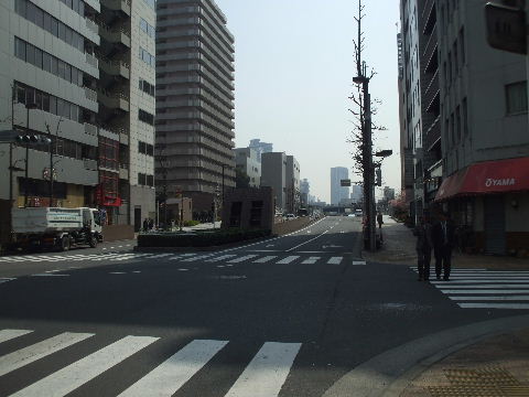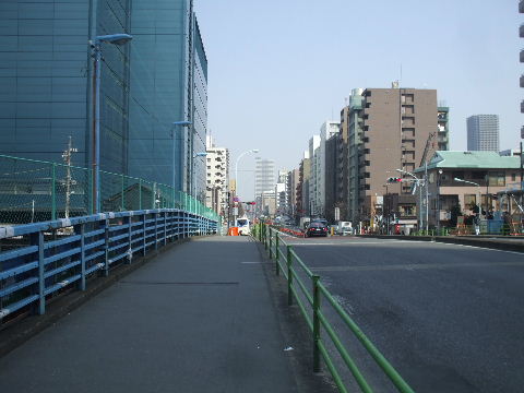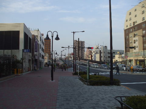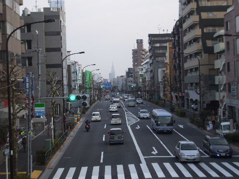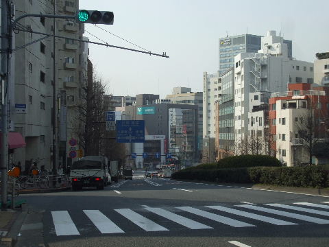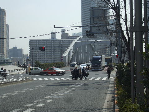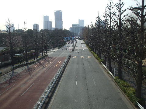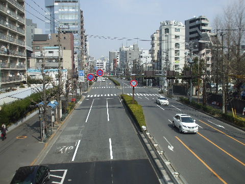 12:26さかなクンがいるかも知れない海洋大学前の歩道橋から進行 方向を見る。この時点では北東に向かっているがこの先少しずつ左 へ折れていって清澄白河駅まで行くと北向きに変わる。見えている 交差点の右すぐには地下にJR京葉線の越中島駅がある。 |