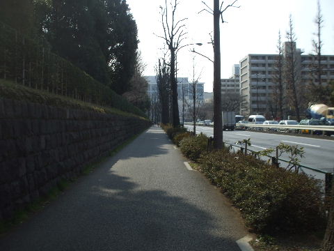 14:35道路左側に見える小石川後楽園の北から西に沿って進む。 |
