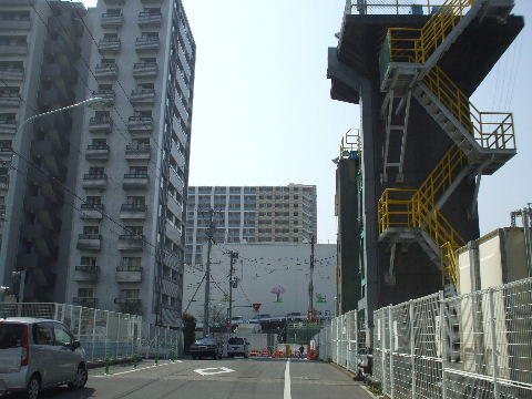 11:55浜前水門横の橋を渡りすぐ突当りを左折。突当りでは隅田川 を渡る新しい橋を建設中。 |