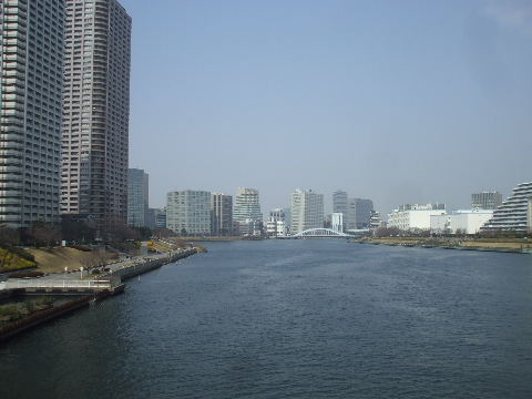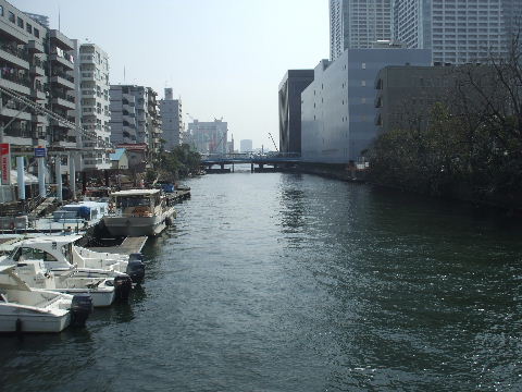 12:21橋から上流を見ると隅田川との分岐点がすぐ。奥に見える橋 は永代橋。 |