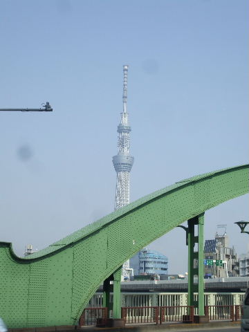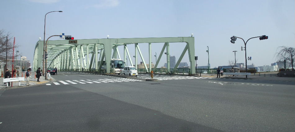 13:39すぐ隅田川。厩橋で渡る。地下鉄は橋の真下を避けて上下 線が両側に分かれて通っているようだ。 |