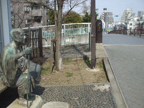12:41海辺橋で仙台堀川を渡る。座っている爺さんは松尾芭蕉らし い。 |