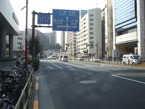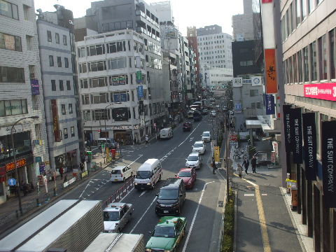 14:46飯田橋交差点歩道橋から進行方向、大久保通りを見る。この 下を大江戸線とメトロ東西線が並んで走っている。 |