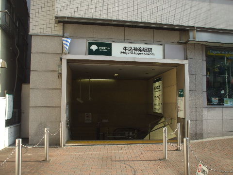 | 14:55神楽坂上交差点を過ぎて少し行くと牛込神楽坂駅。 |