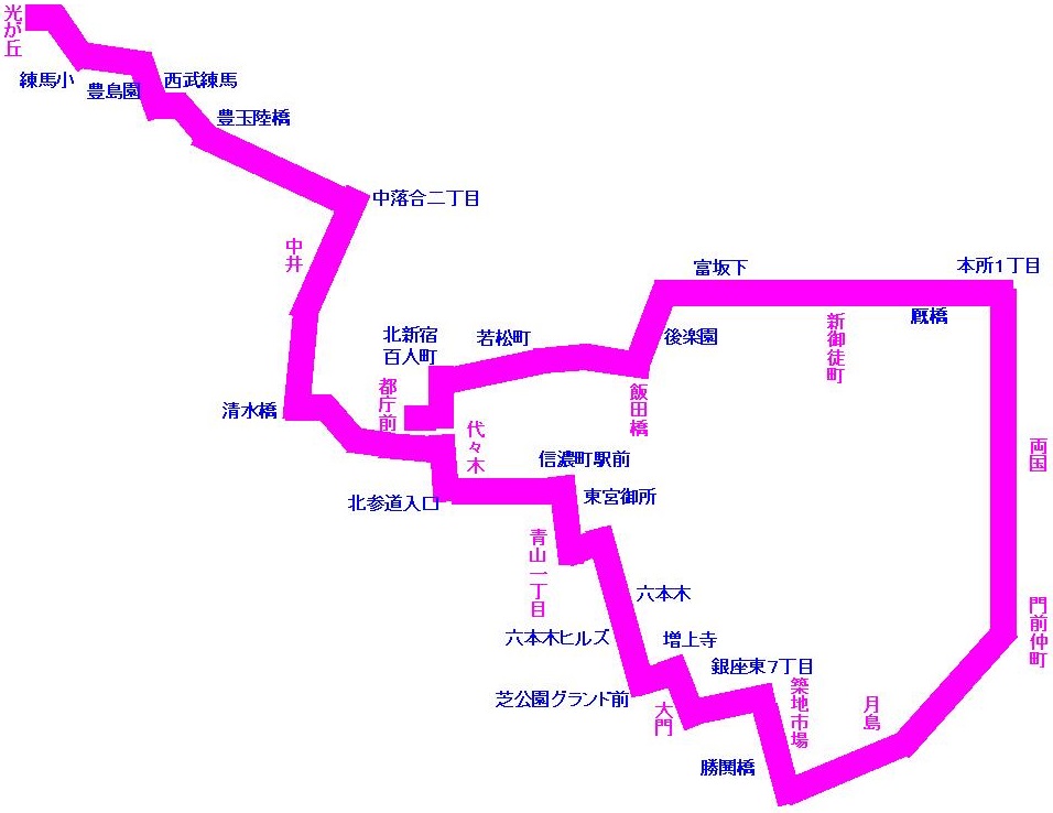 JR山手線のように電車がぐるぐる回って走ってはいないが地図や路線図で見ると一応、環になっているのでそれに沿ってまわってみた。距離は都庁前を出て都庁前に戻って来ると28キロくらいで山手線より少し短く、尻尾の部分を光が丘まで行くと計40キロくらいになり山手線より少し長くなる。