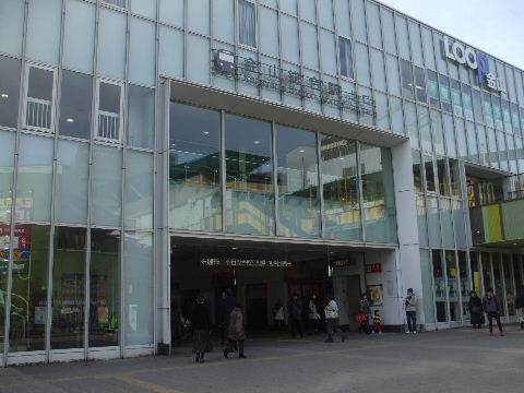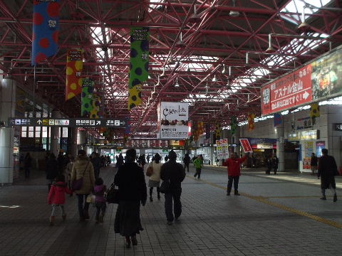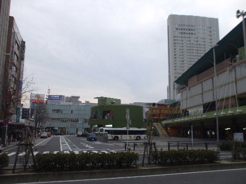 | 10:01通り抜け自由通路で南口へ。 | 10:03地下鉄金山駅は2面4線でその両外側ホームが名城線。そ れに加えて枝分かれする名港線のトンネルを跨ぐ為に右回りの線 が少し回り込むような形になっていて次の西高蔵まで両方のトンネ ルが結構離れて通っている。今日は進行方向が左回りなのでその トンネルが通っている金山総合駅南交差点信号を渡って南へ。 |