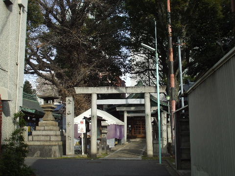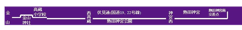 10:05交差点右手前には金山の名前の元になっている 金山神社がある。地下鉄左回りのトンネルは神社の 下を通っているが右回りのトンネルはひとつ西の 新尾頭交差点辺りを通っている。 |
