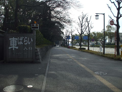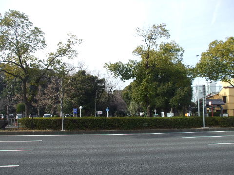 | 10:20少し進むと右に熱田神宮公園がある。入口左の森は断夫山 (だんぷさん)古墳で奥には熱田球場がある。 |