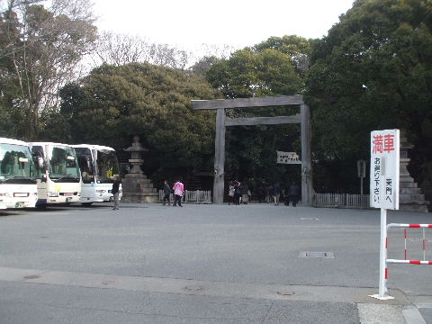 | 10:31熱田神宮西門前を通過。観光パスで来るとここから入る。 | 10:33熱田神宮南交差点。トンネルはここで左へ カーブし東に方向を変える。電車は車のように急 カーブ出来ないので普通はトンネルが道路から はみ出るがここは道路が斜めに交差している鈍角側な ので殆んど交差点下でカーブ出来ているようだ。 |