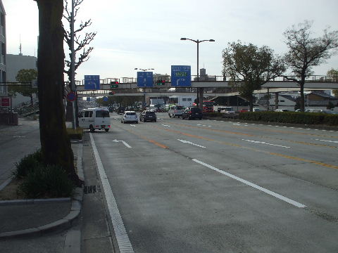 | 16:57日比野交差点に出、高速道路の下を南へ進む。地下鉄はこ の道路の下を名古屋港までほぼ直線。 |