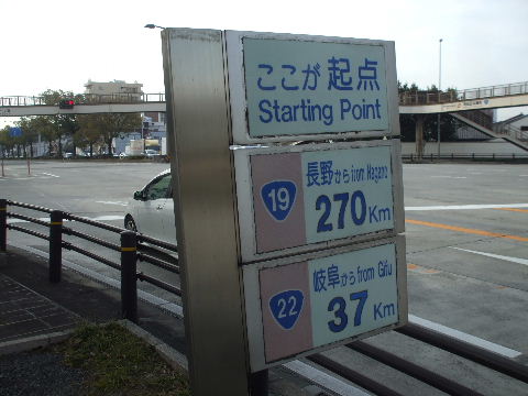 | 10:34交差点北東角歩道橋の下にこの標識。国道19、 22号線は1号線のここから始まる。「ここが起点」と いいながら「長野まで」じゃなく「長野から」に なっているのがちょっと変な感じがする。 |