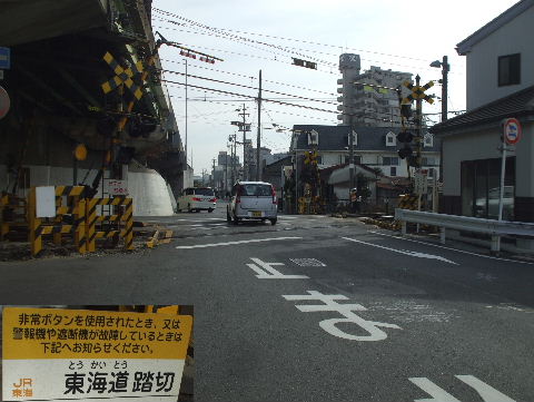 10;48陸橋下に沿って行くと再び旧東海道に出、その名前を貰った 東海道線を踏切で渡る。踏切の名前も「東海道踏切」。他に東海道 線×旧東海道の踏切があったらどんな名前になっているのか気に なるところ。 |