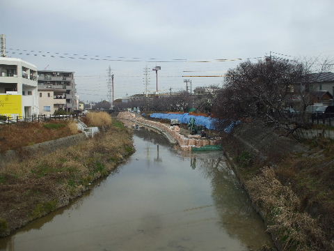 | 11:17新瑞橋交差点を過ぎると名古屋東側の丘陵部に かかり始め少し上り坂を上がったところで山崎川を 渡る。落合橋。上流は桜の名所だが護岸工事中。 この橋を過ぎるとトンネルは左へカーブし始め次の 駅までは民家の下を走る。 |