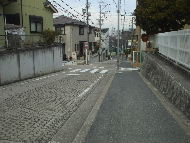 | 14:58交差点を左折南へ。 | 14:59一筋目を右折。金城小学校の北を西へ。 | 15:00小学校に沿って左折南へ。奥に木が見えるお寺の向こうを右折。地下鉄は手前から向こうへ斜めに小学校と寺の下を通っている。 | 15:01西へ進み一筋目を左折。 | 15:02南へ。地下鉄はこの道の下を通っている。 |