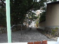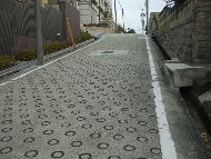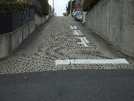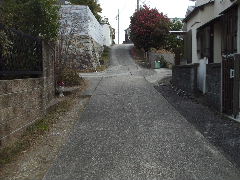 | 13:17かなり上った途中にはこんな急な階段道路がある。この辺りには何ヶ所かこういう所がある。 | 13:18今度は下り。突当りを右。 | 13:19すぐ左折するとまた上り。 | 13:20下り坂の先に突き当りここで初めて左折右折で左斜め前方に進む感じになる。 | 13:21下がってまた上がるこの道路の下をトンネルが通っている。 |