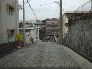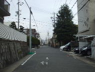 | 13:11本山交差点の一筋北の道に入り三つ目の十字路で右折。 | 13:13右左折を繰り返して大きく見ると右斜め前方方向へ進む。 | 13:14突当りを右へ。 | 13:14すぐ左折。 | 13:15坂が急になり舗装がコンクリートに丸い穴ぼこを付けたものに変わる。 |