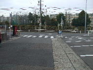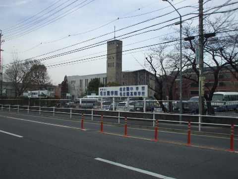 | 11:57八事交差点。鶴舞線が左右に通る。かなりカーブしているが 地下鉄もこれに沿って通っておりこの辺では結構窮屈そうな音をた てて走る。奥に見える建物は中京大学。 |