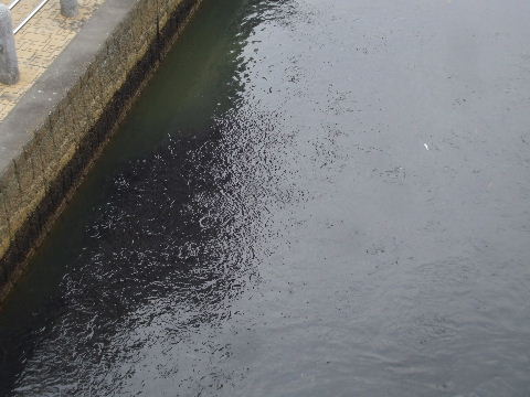 | 14:50志賀橋で黒川を渡る。ボラの小さいのが群れになって居り川 面が細波だって黒ずんで見える。 |