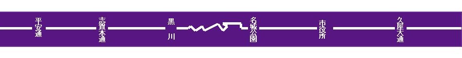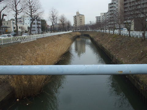 | 15:04黒川に突き当る。真っすぐ行きたいが橋がないので右へ一 筋、大津通の城北橋へ迂回。 |