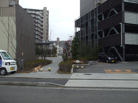 | 15:07城北住宅の間を南へ進む。地下鉄はこの通路の下を通って おり通路途中に換気口がある。名城公園駅もこの先、通路下にあ る。 |
