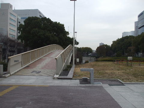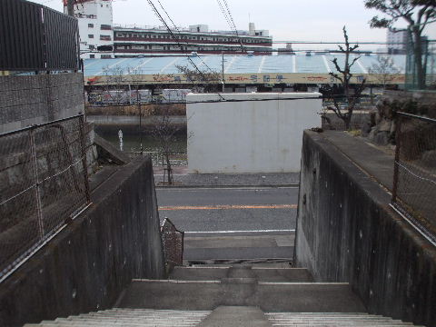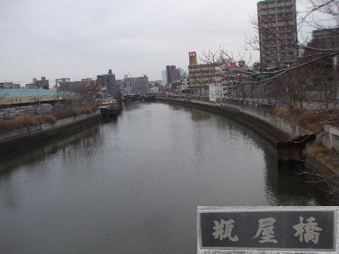 | 16:47少し下流の瓶屋橋(かめやばし)で堀川対岸へ渡る。名古屋 港方面のトンネルがちょうどこの橋の下を通り、金山方面のは一 つ上流の住吉橋との中間辺りを横切っている。 |