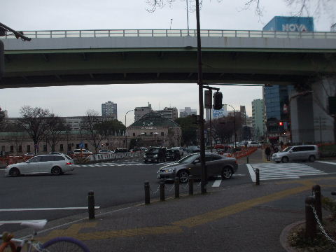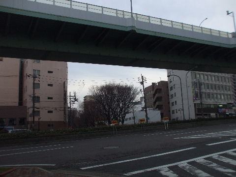 17:10地下鉄、道路、新幹線、高速道路の4段重ねの六番町交差 点を通過。駅は交差点手前下にある。 |