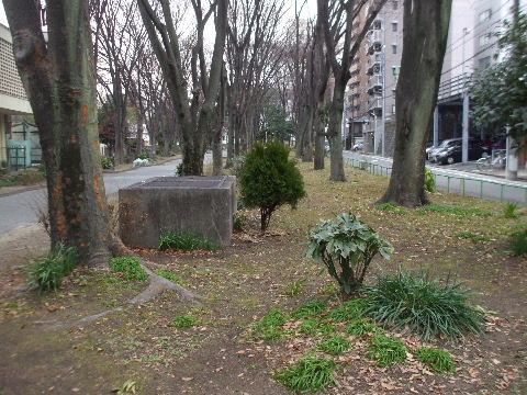 | 16:23長細い公園を進む。 | 16:23植え込みに換気口があり駅の上なので出発べルの音が聞こ える。 |