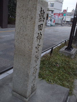 | 16:43新尾頭交差点すぐ南に こんな石碑。歩道から見える 側は3面共のっぺらぼうで車道に 向いた側だけに「熱田神宮第一 神門址」と標してある。田舎の 神社によくえらい離れた所に 鳥居が立っているのがあるが あんなのがあったのだろうか。 歩道から見える側に説明板 立てるといいのに。 |