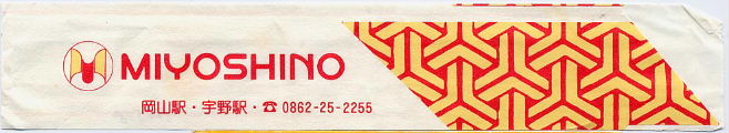 MIYOSHINO 1991年。これも岡山駅の駅弁。1988年に瀬戸大橋が開通した後も国鉄以外の宇高 航路が暫らく残っており、この頃はまだ宇野駅でも売っていたようで駅名が入っている。 |