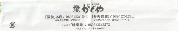 | かどや。 2019年。宇和島駅前にある店。裏面に店名が入っている。 |