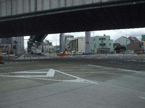 | 2014年4月6日。一番端の車線も直線になって使えるようになった ので漸く中央の高速下整備が始まっている。 |