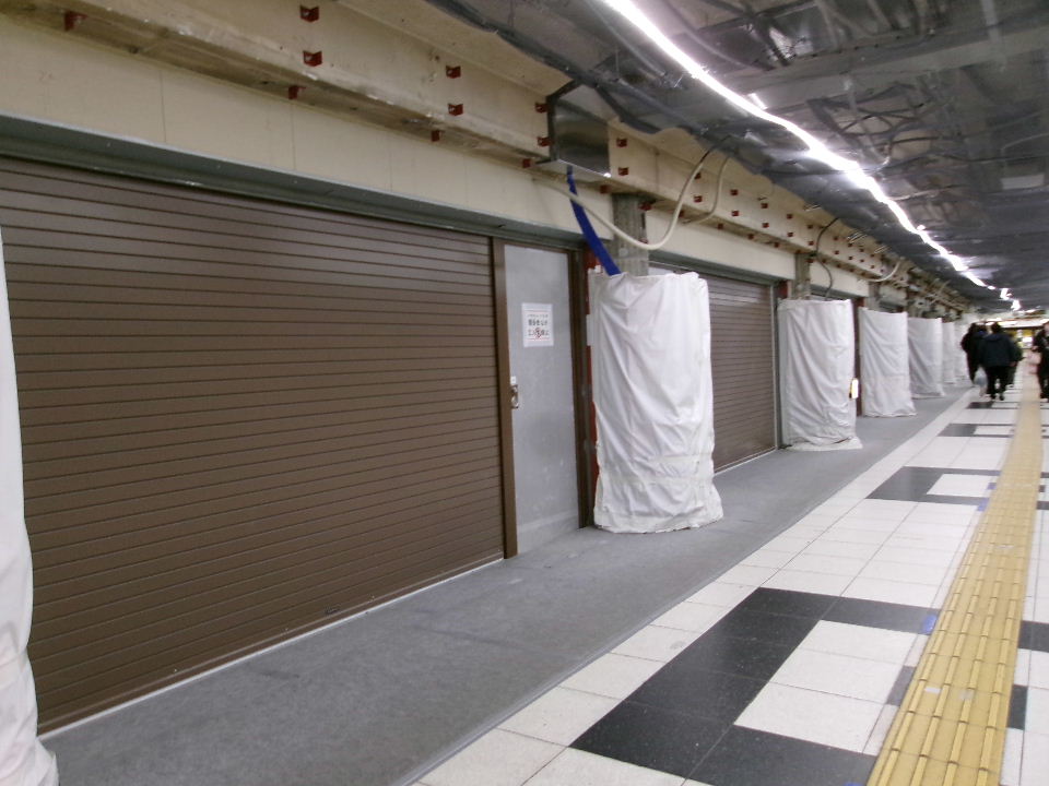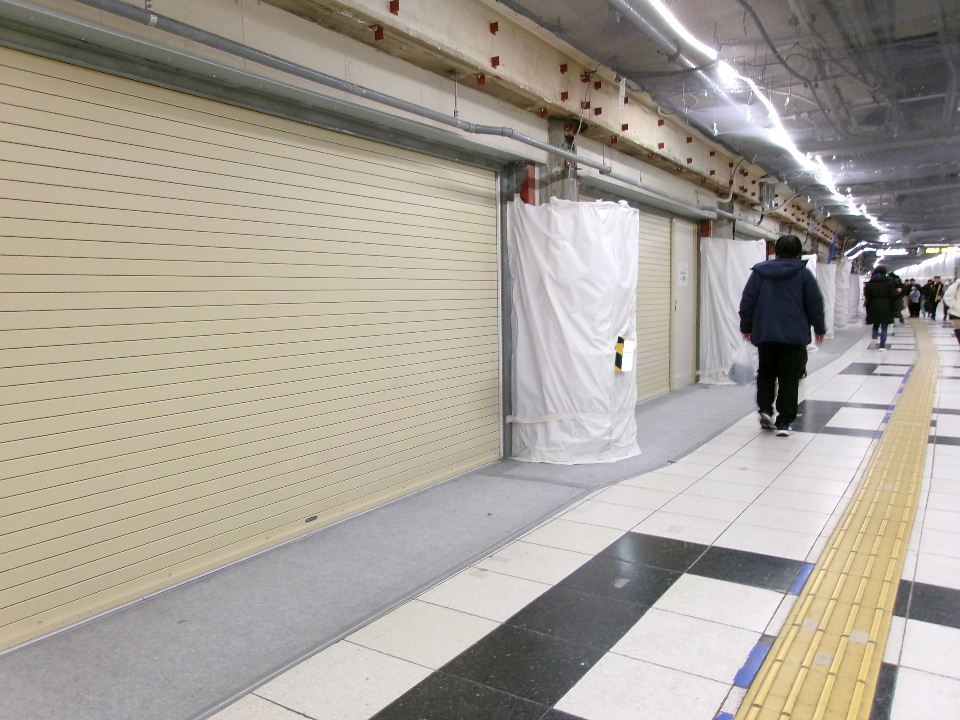 | 2026年02月07日。地下街西側の工事塀が無く なった。シャッターが新しくなったか。 南寄りと北寄りで色が違う。これは南。 |
