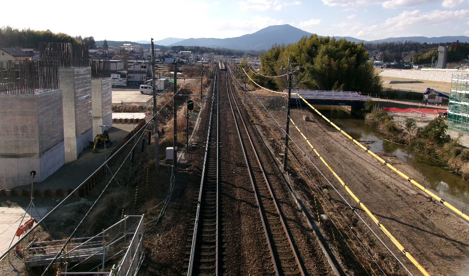 | 2018年02月17日。線路の間で工事をやっている感じから工事現場の中を線路が通っているような感じに変わった。 |