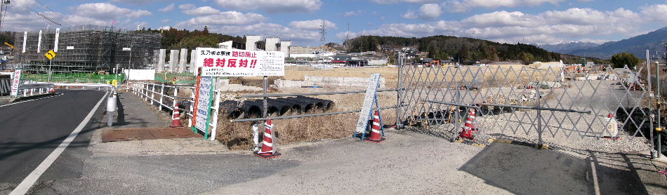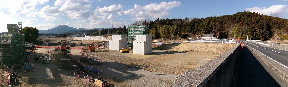 | 2015年01月17日。以前から新幹線と在来線の間で何か ごそごそやっていた所。道路側にもシートがかけられている。 |