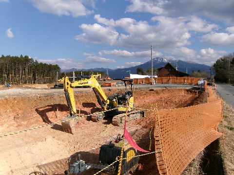 | 2021年03月14日。椿神社社務所建設中。 | 2021年03月11日。駅西の現場では小屋が建ってこの中で 穴掘りか。 |