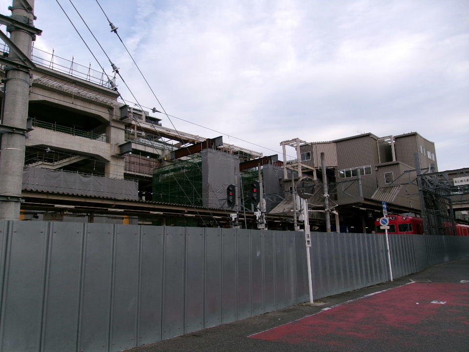 | 2017年09月29日。駅前から見る。 | 2017年11月04日。落下物防止用の柵が二段になっている。 |