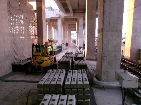 | 駅近くの図書館のロビーに置いてある高架完成予想模型。 | 今やっている工事。 |