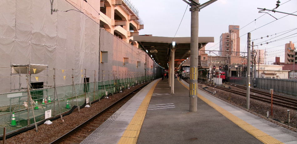 | 2010年5月1日。下り(名古屋方面)ホームの真ん中に3本、屋根を突き抜けてコンクリート柱が立てられている。仮駅建設に関係あり?。上下ホームのうどん店は2009年末に閉店している。 | 2010年7月10日。本線ホームの中程、屋根が撤去されている。エレベーター用の跨線橋が建設される。 |